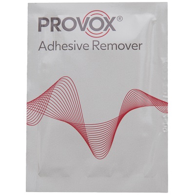 Provox Adhesive Remover wordt gebruikt om de pleister te verwijderen zonder de huid te beschadigen. Dit doekje bevat een vloeistof die de lijmlaag oplost, zodat de pleister gemakkelijk loslaat. Maak de pleister vochtig met het Provox Adhesive Remover doekje. Vervolgens kunt u de pleister voorzichtig van de huid verwijderen.